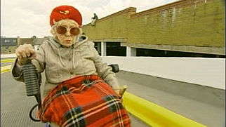 rolled slowly up to the barriers on her electric wheelchair, leant